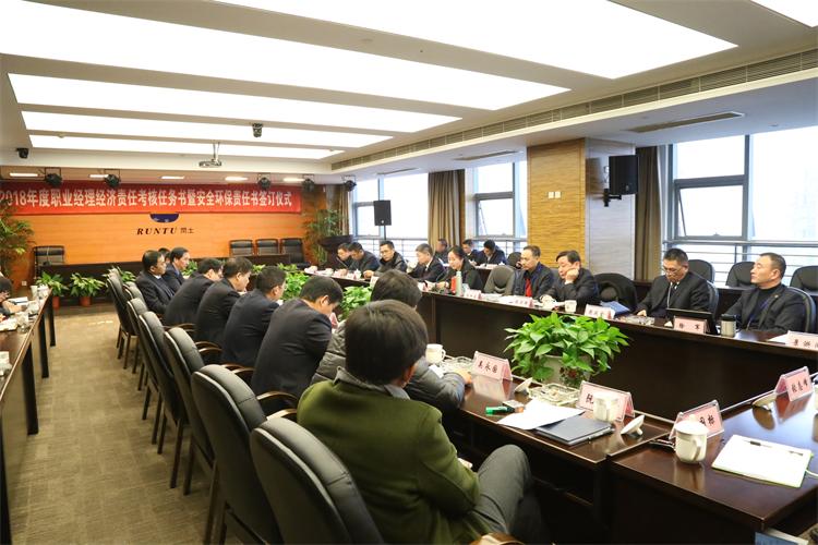 2018年1月3日上午,2018年度職業(yè)經(jīng)理經(jīng)濟(jì)責(zé)任考核任務(wù)書暨安全環(huán)保責(zé)任書簽訂儀式在閏土大廈舉行。阮靜波董事長、徐萬福總經(jīng)理等高層領(lǐng)導(dǎo)與各職業(yè)經(jīng)理齊聚一堂,為做好公司新一年度的安全環(huán)保工作謀篇布局。