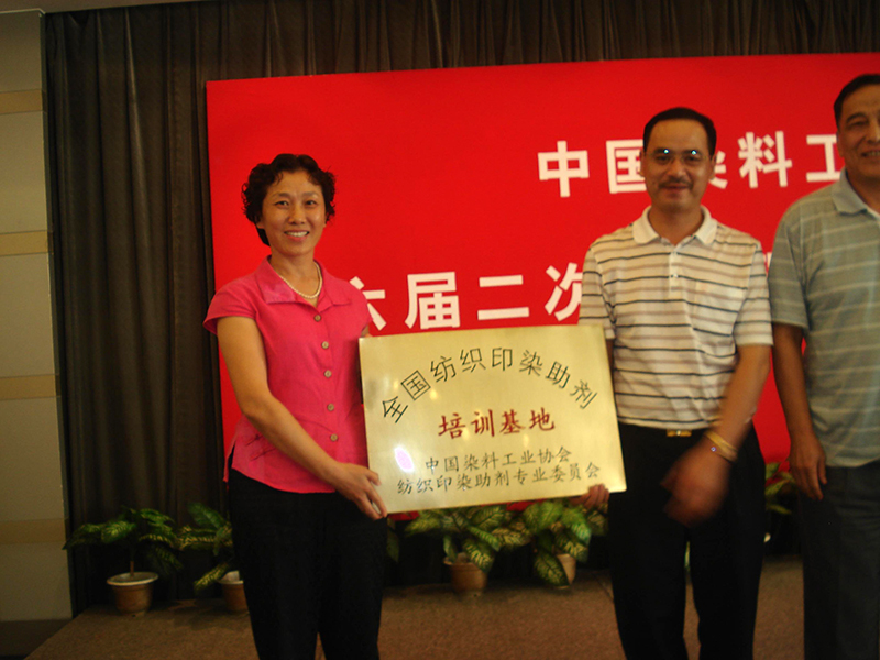阮加春總經理代表中國染料協會理事會頒發“全國紡織染料助劑培訓基地”牌匾。