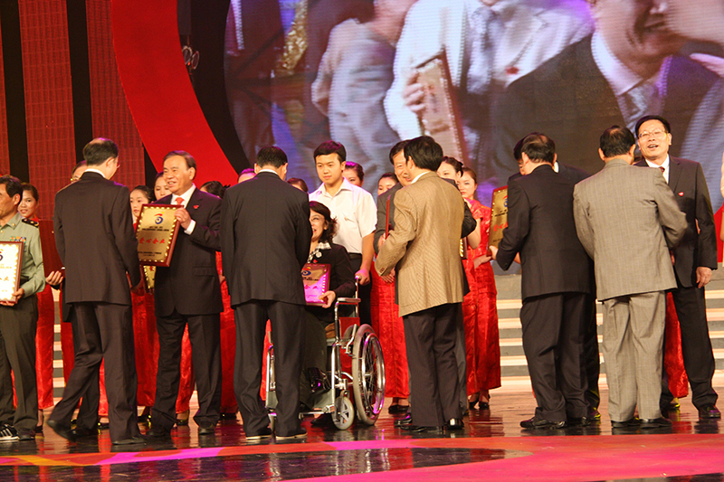 10月11日,阮加春總經(jīng)理在第八屆全國(guó)殘運(yùn)會(huì)倒計(jì)時(shí)一周年大型愛心助殘晚會(huì)上接受中國(guó)殘聯(lián)主席張海迪(坐輪椅者)頒發(fā)“愛心企業(yè)”獎(jiǎng)牌。浙江省省長(zhǎng)呂祖善等領(lǐng)導(dǎo)出席了本次活動(dòng)。